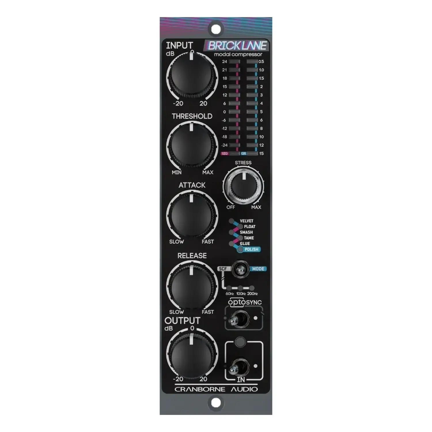 Cranborne Audio Brick Lane 500 is a 500 Series analogue PWM compressor with six operating modes, Stress harmonic control, Analogue Lookahead, and OPTOSYNC stereo linking. It combines precision mastering capabilities with creative tonal shaping, redefining what analogue compression can achieve.
