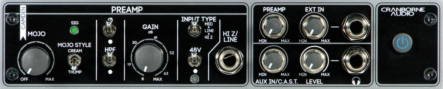 Connectivity is extensive, with balanced XLR and impedance-balanced 1/4″ outputs, a switchable –10 dB pad for low-headroom interfaces, and a Link output for DI and re-amping workflows. The C.A.S.T. port allows integration with Cranborne 500R8 and 500ADAT systems, sending preamp signals directly into 500 series modules while returning stereo mixes to the Cranborne Audio Camden EC1’s headphone outputs over a single Cat 5e/6/7 cable.
