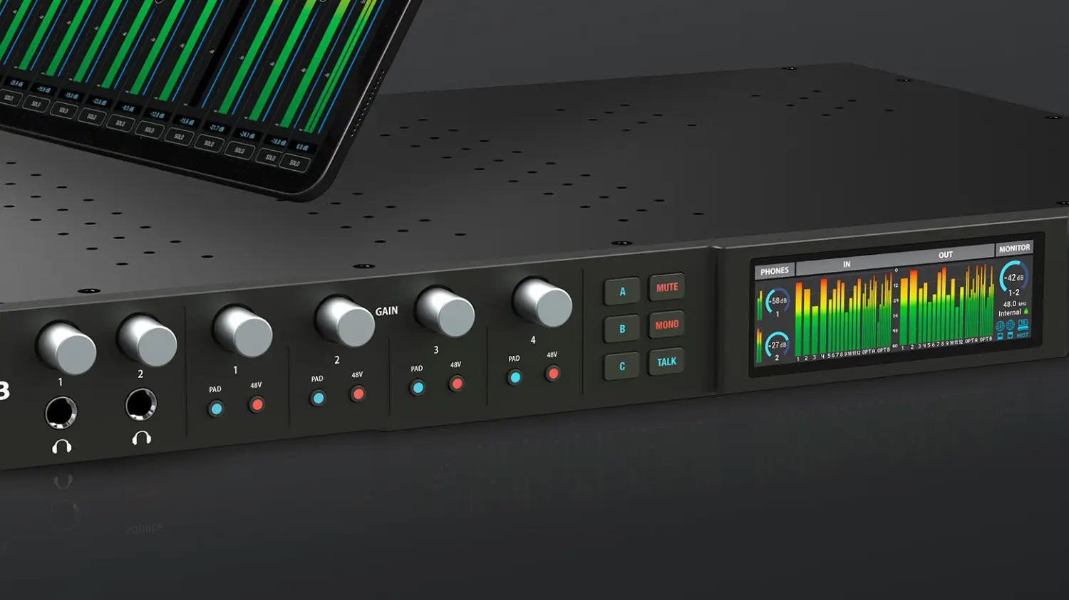 Four transparent microphone preamps deliver outstanding specifications, including -114 dB THD+N, 118 dB dynamic range and -129 dBu EIN. Each offers pad, phantom power and gain adjustment, with channels 3 and 4 featuring inserts for hardware processing or serving as extra balanced line inputs. Monitoring flexibility includes a group controller for up to twelve outputs, three-way speaker selection, and integrated talkback.