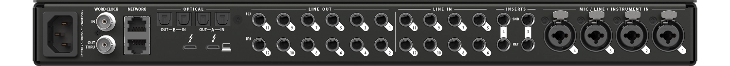 The interface provides 60 simultaneous channels with 28 inputs and 32 outputs available concurrently, giving users the ability to connect microphones, instruments, processors, monitoring systems and other studio hardware without limitation. Its high performance driver ensures round trip latency as low as 1.8 ms at 96 kHz with a 32 sample buffer.