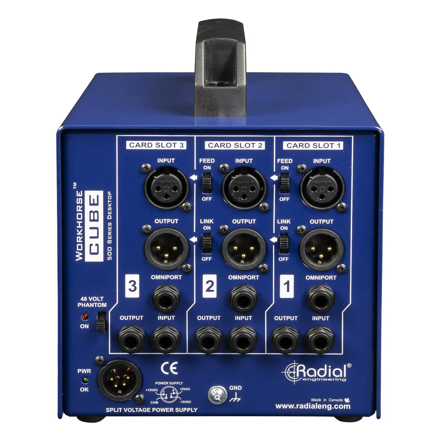 The Radial Engineering Cube 3-Slot Power Rack is a portable desktop chassis for 500 Series modules, offering full Radial and API compatibility, rugged steel construction, 500mA of shared current plus 48V phantom power, and flexible rear-panel connectivity. Its innovative feed and Omniport functions enable easy module chaining, stereo linking, and expanded creative setups for custom channel strips, guitar front ends, and reamping.