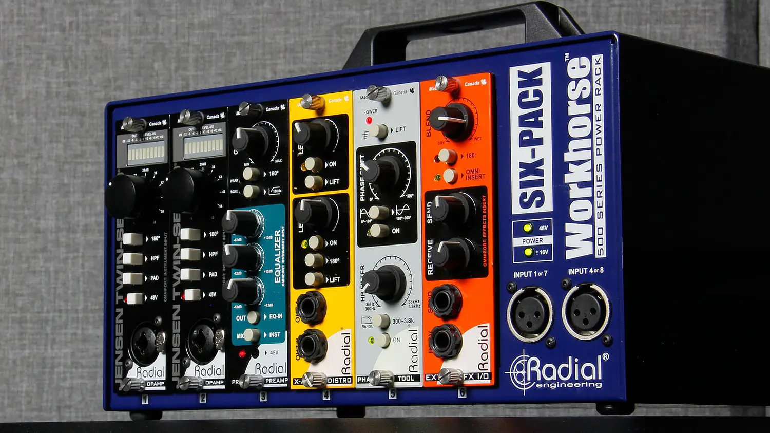 The Radial Engineering SixPack is a rugged 6-slot desktop power rack for 500 Series modules, built to let you mix and match up to six processors and power them safely in a compact, portable format. Its heavy 14-gauge steel chassis with powder-coat finish adds durability and effective shielding from stray magnetic fields, while the external power supply connects via a locking 5-pin XLR to reduce induced noise.